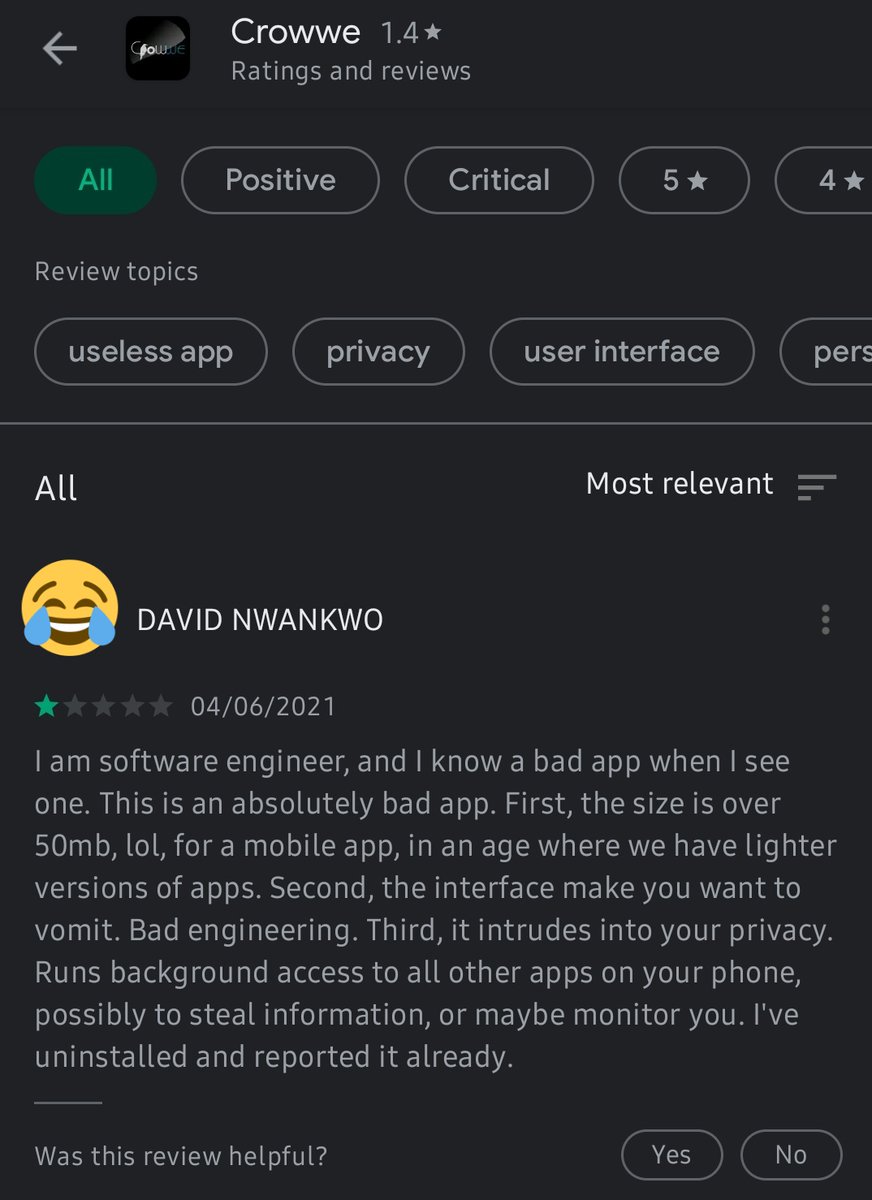 Crowwe, a wholly nigerian instant messaging app that aimed to fill the gap left by twitter after it was banned by the regime, has been removed from google playstore.